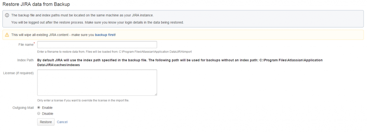 1. Поле «Индексный путь» (Index Path) указывает, где JIRA будет восстанавливать данные индекса поиска из файла архива ZIP-архива. Это местоположение (которое не может быть изменено) соответствует пути индекса, указанному в файле резервной копии zipped. Если, однако, этот файл резервной копии не указывает путь к индексу, JIRA будет восстанавливать индекс поиска в подкаталоге caches / indexs домашнего каталога JIRA.