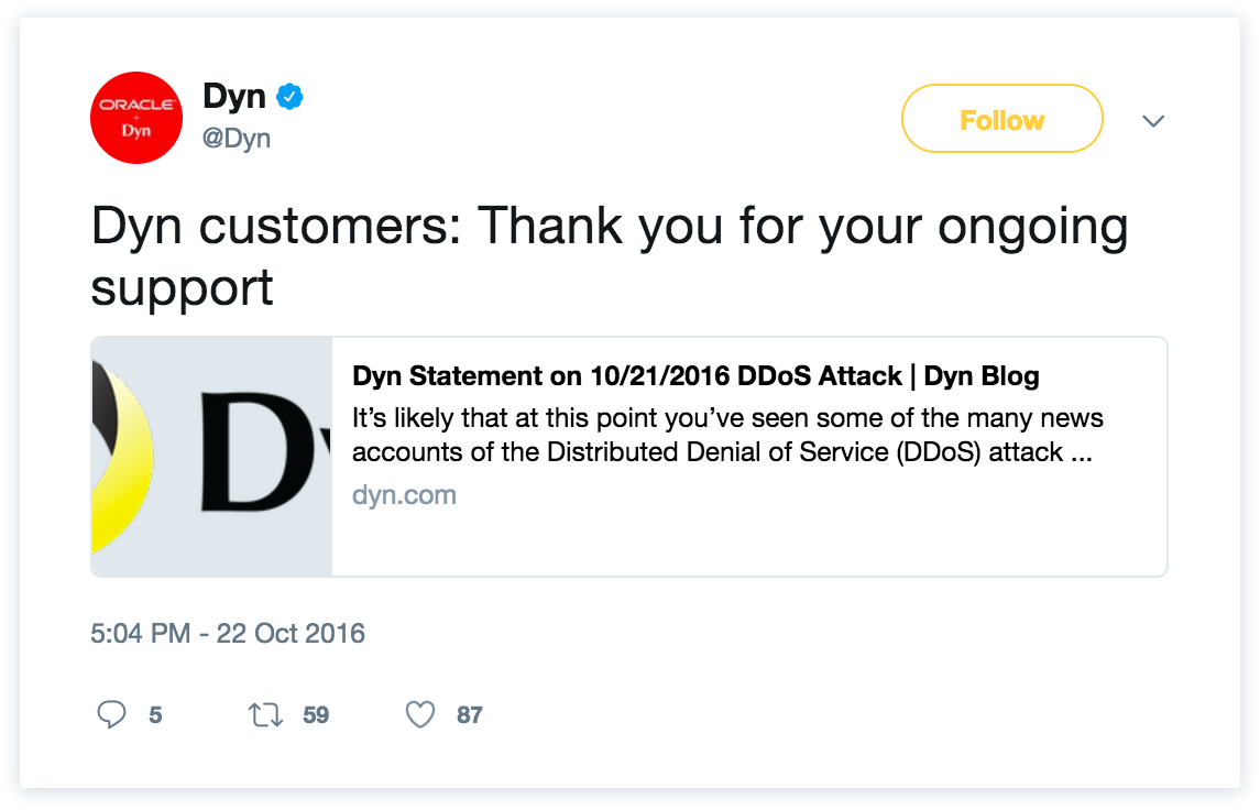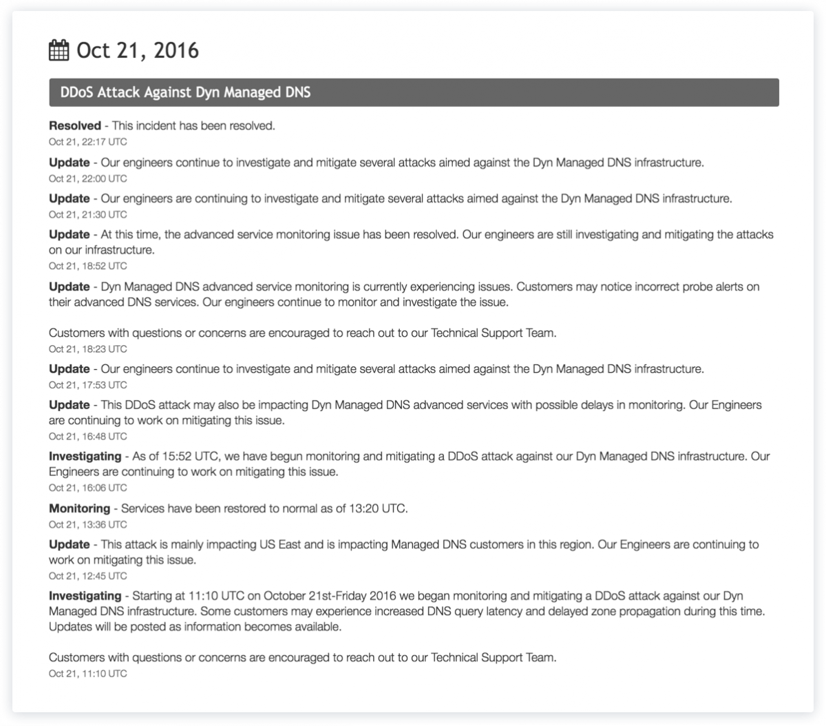 Но независимо от того, какой инструмент вы используете, чтобы дать своим клиентам 4-1-1, общение с людьми будет иметь большое значение. С другой стороны проблемы есть реальные люди, которые полагаются на ваш сервис и полагаются на вас, чтобы держать их в курсе, когда что-то не так. Хотя шаблоны идеальны в идеальном мире, вам понадобятся люди, способные создавать четкие, лаконичные, чуткие и актуальные сообщения, чтобы завоевать доверие клиентов даже в самые худшие времена. Взять хотя бы Дина. У них был огромный сбой во время одной из крупнейших DDoS-атак в истории, но пользователи по-прежнему благодарили их за откровенность, проявленную ими в эти часы прерванного обслуживания:
