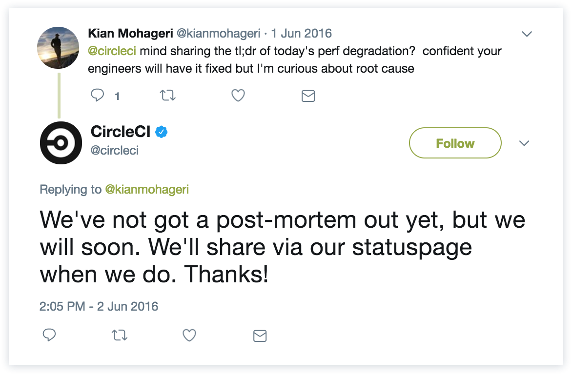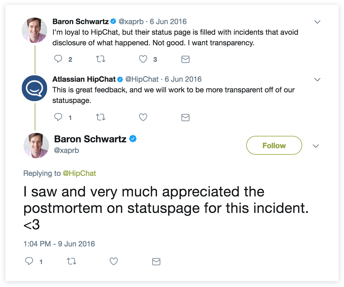 Эта agile ценность сотрудничества с заказчиками по сравнению с переговорами по контракту сводится к работе с вашими клиентами для обеспечения наилучшего продукта и опыта. Для нас это означает, что необходимо настроить надлежащие каналы обратной связи, чтобы клиенты могли озвучивать проблемы и предупреждать вас о любой проблеме, которую они имеют (используя такие инструменты, как Jira Service Desk, Twitter и т. Д.). Компании мирового уровня понимают, что клиенты ожидают ответа на свои отзывы и хотят участвовать, когда дело доходит до улучшения вашего продукта и вашего процесса реагирования на инциденты. Некоторое сочувствие и объяснение имеют большое значение - и клиенты не боятся просить об этом - как показано в этих твитах: