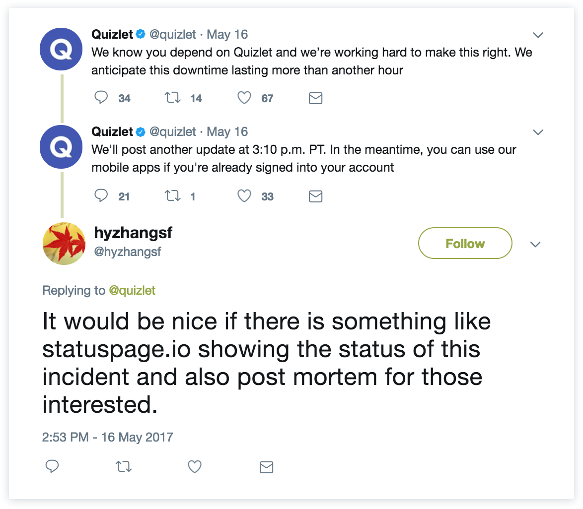 Если снова взглянуть на инцидент с Дином, вы можете видеть, что его команда не теряла времени, сообщая обновления своим пользователям. В течение 11-часового инцидента они обновляли свою страницу состояния 11 раз (в среднем 61 минута между обновлениями). Их страница состояния позволила им иметь единственное место для общения об инциденте, вместо того, чтобы тратить время на поиск списков рассылки по электронной почте или выяснение того, как разместить обновления в 140 символов в Twitter. Другими словами, они получили сообщение там, все еще сосредотачиваясь прежде всего на восстановлении их обслуживания.