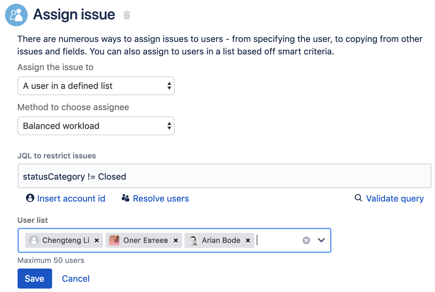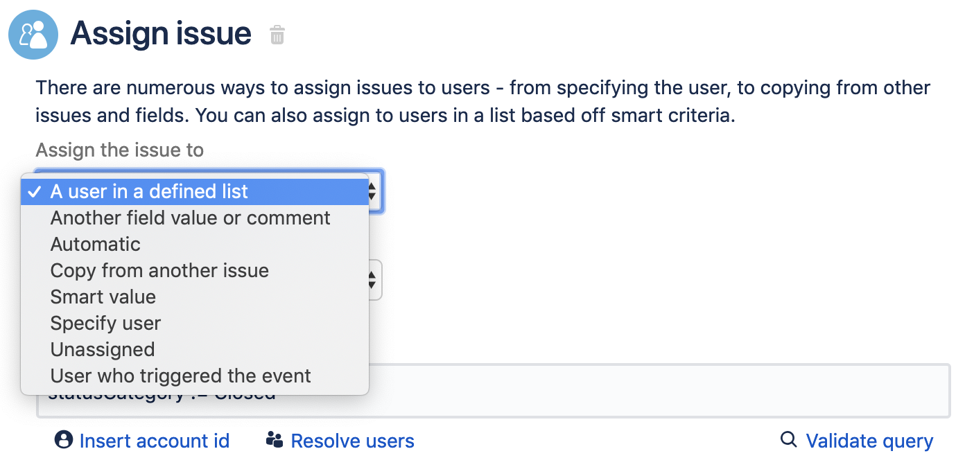 После того, как вы определили, что будет запускать правило и условия для правила, вы используете действие «Назначить задачу» ("Assign issue"). Для этого варианта использования задача назначается пользователю в вашей команде, и вы выбираете вариант «Пользователь в определенном списке»: