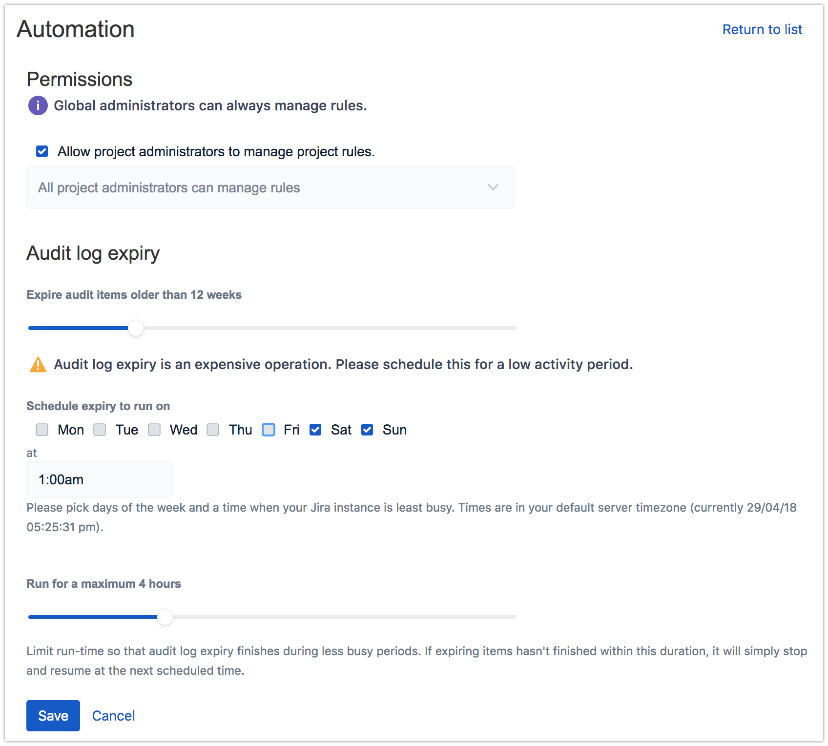 Эта операция может быть дорогостоящей и вызывать большую дополнительную нагрузку на базу данных, если у вас много элементов журнала аудита. Убедитесь, что вы выбрали подходящее время и установили максимальное время выполнения, чтобы истечение срока действия происходило только в наименее загруженные периоды для вашего экземпляра Jira (например, в выходные).