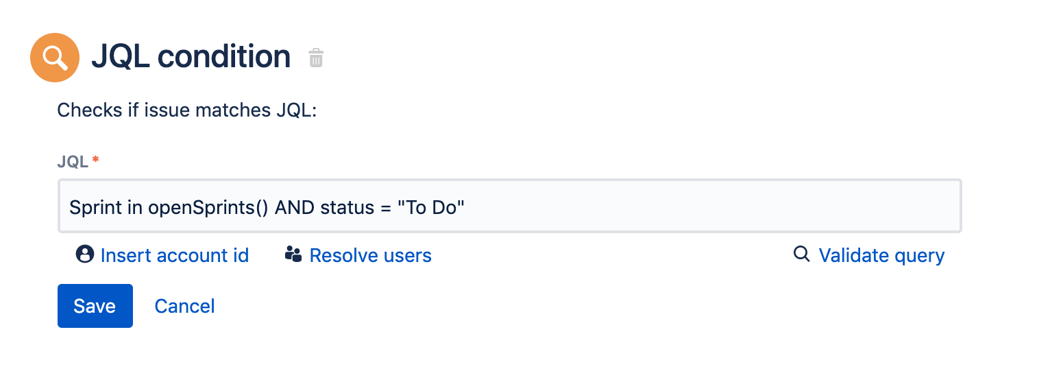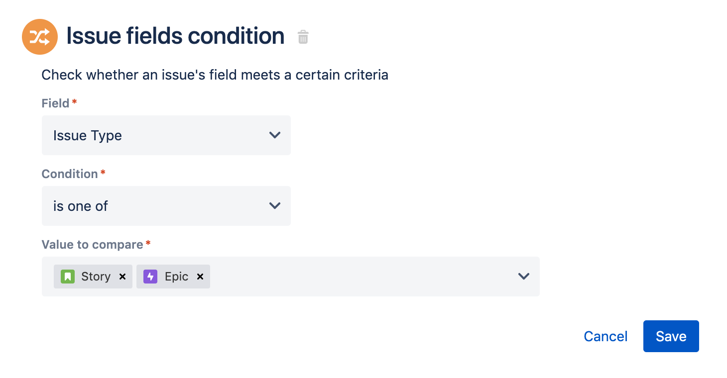 Мы рекомендуем условие «Задача» ("Issue"), так как оно наиболее простое в использовании, имеет лучшую производительность из трех условий и не требует каких-либо интеллектуальных значений или JQL.