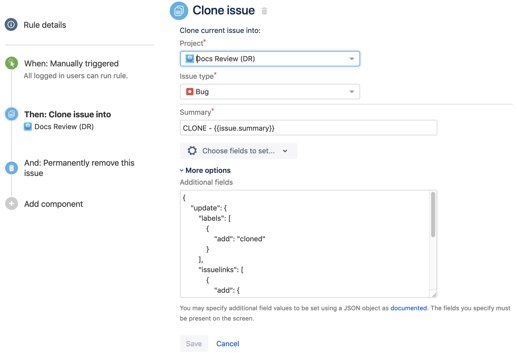 - Добавьте действие «Удалить задачу» ("Delete issue'"), чтобы безопасно удалить исходную задачу.