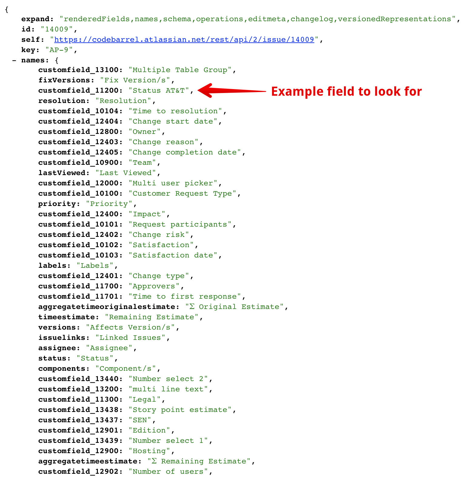 Иногда пользовательские поля в Jira могут быть сложными. В приведенном выше URL-адресе обратите внимание на параметр ? expand = names? Это дает следующее удобное руководство в начале вывода: