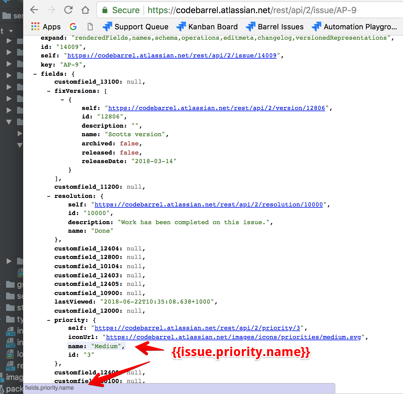 В этом примере выбрано поле приоритета, что означает, что интеллектуальным значением является {{issue.fields.priority.name}}, однако раздел полей не требуется, поэтому вы можете просто использовать {{issue.priority.name}} или сократите его до {{priority.name}}.