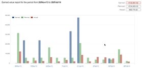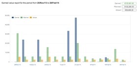 Фактические данные - это либо затраты (красные столбцы), либо доходы (желтые столбцы). При наведении курсора на полоски откроется всплывающая подсказка, показывающая точные суммы. Можно щелкнуть метки дат на оси x, чтобы перейти к подробной информации о плановой, фактической и заработанной стоимости за период, заканчивающийся в эту дату.