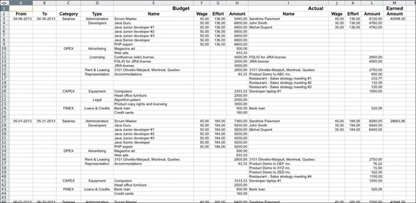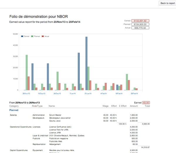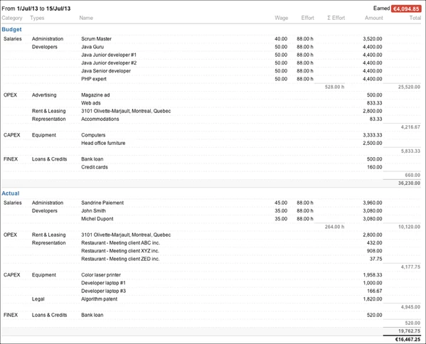 Подробная информация за все периоды представлена на графике. Каждый из этих разделов показывает список запланированных и фактических платежей, упорядоченных в алфавитном порядке и сгруппированных по категориям, а затем по типам (или ролям). Заработанная стоимость за этот период отображается ромбиком в заголовке справа. Зеленая ромбовидная таблетка указывает на то, что заработанная стоимость превышает запланированную (заработано ≥ запланировано), а красная ромбовидная таблетка указывает на противоположное (заработано <запланировано).