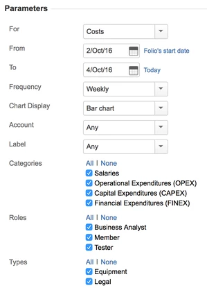Чтобы изменить период, охватываемый отчетом, просто установите даты в полях «От» ("From") и «До» ("To") на любые даты, которые вы хотите. Фактический рассматриваемый период будет охватывать самую позднюю из даты начала фолио и дату, указанную в поле «От» ("From") (расходы, определенные для возникновения до начала фолио, не будут учитываться). Вы можете указать, какую частоту следует использовать в отчете для разбивки всего периода. Например, при выборе «Ежемесячная частота» ("Monthly frequency") будут отображаться значения доходов и расходов с разбивкой по календарным месяцам. Выберите значение «Итого» ("Total") в разделе «Частота» ("Frequency"), чтобы получить заработанные стоимости и все расходы за полный период без разбивки. Наконец, вы можете ограничить рассматриваемые платежи определенным количеством типов и / или ролей. Просто выберите / отмените выбор интересующих вас типов, и отчет будет мгновенно обновлен, чтобы отразить новый выбор. Выбор или отмена выбора категории приведет к соответствующему обновлению списка доступных типов и ролей. См. Таблицу ниже для получения подробной информации о параметрах отчета.