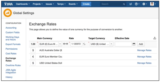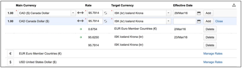 Чтобы обновить обменный курс валюты, вы можете просмотреть курсы валюты, нажав кнопку «Управление курсами» ("Manage Rates") справа от строки данной валюты. Отсюда вы можете щелкнуть курс, целевую валюту или дату вступления в силу строки и в интерактивном режиме изменить значения, изменения применяются при нажатии клавиши ввода или кнопки обновления.