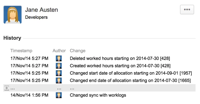 ) на панели навигации панели сведений. В разделе «История» ("History") отображается таблица, в которой перечислены все изменения, произошедшие с выбранным элементом, и связанные с ними данные, такие как вложения, заработная плата, доступность и отработанные часы. Отображаемые изменения включают создания, обновления и удаления и сортируются от самых последних к самым старым. Обновление записывается для каждого измененного поля, поэтому одно изменение «Расходы»"Expense" может добавить много строк в таблицу История "History". Кроме того, если в таблице содержится более пяти записей, некоторые записи по умолчанию будут скрыты: щелкните строку с многоточием (...), чтобы развернуть таблицу и отобразить все изменения.