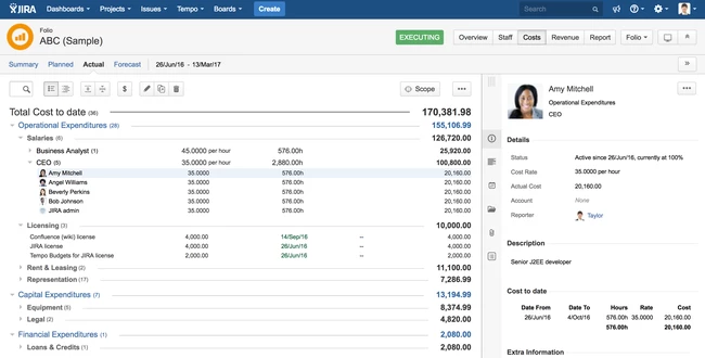 Вкладка «Затраты фолио» позволяет планировать расходы по проекту, отслеживать их во время выполнения проекта и получать прогнозы будущих затрат на основе результатов текущей работы команды. Перемещайтесь между «Резюме» ("Summary"), «Запланировано» ("Planned"), «Фактически» ("Actual") и «Прогноз» ("Forecast") с помощью второго уровня вкладок, который появляется сразу под заголовком, когда выбрана вкладка «Затраты» ("Costs").