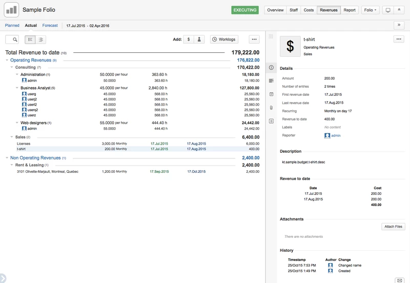 Вкладка «Доходы фолио» позволяет вам планировать доходы вашего проекта, отслеживать их во время выполнения проекта и получать прогнозы будущих доходов на основе результатов работы вашей текущей команды. Перемещайтесь между запланированным «Запланировано», фактическим «Фактически» и прогнозным «Прогноз» с помощью второго уровня вкладок, который появляется сразу под заголовком, когда выбрана вкладка «Доходы».