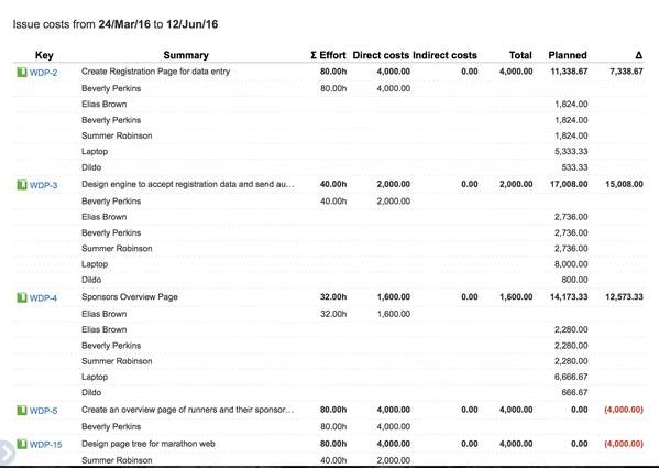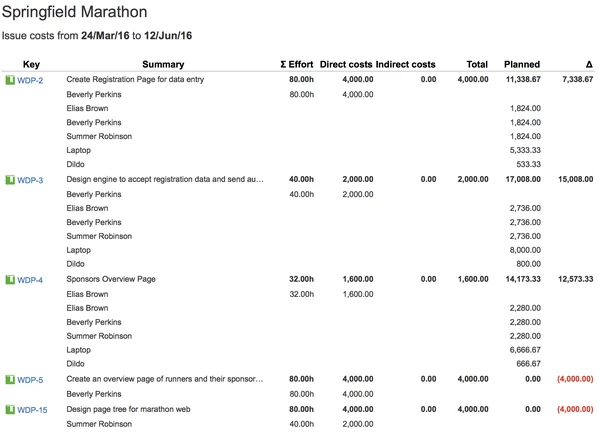 Все остальные расходы, связанные с этой задачей. К ним относятся затраты, не связанные с человеческими ресурсами (например, материалы и т. д.), и усилия, которые не указаны в рабочих журналах. Эти расходы распределяются по всем задачам пропорционально их весу заработанной стоимости (как определено их полем заработанной стоимости) в объеме. Распределение сверхурочных затрат для синхронизированного с сотрудником JIRA немного отличается, поскольку эти затраты распределяются по задачам, по которым сотрудник зарегистрировал время |