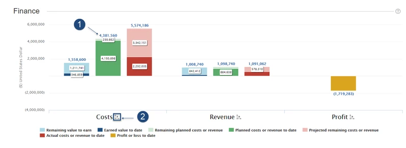 В этом разделе отображаются две диаграммы, которые предоставляют текущую финансовую картину портфолио. Первые столбцы диаграммы позволяют сравнивать различные значения на текущий момент (части ярких столбцов) с прогнозируемыми значениями на момент завершения (части бледных столбцов), такими как предполагаемые затраты или доход на момент завершения.