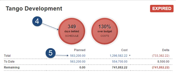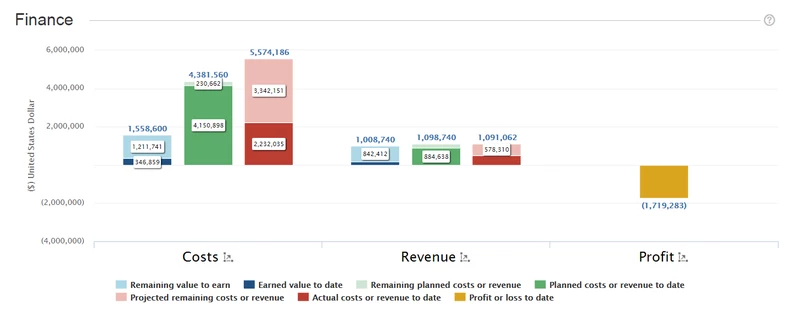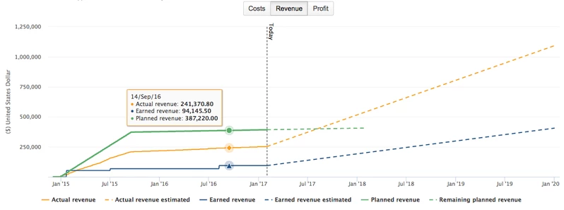 Линейный график в разделе «Финансы» показывает динамику затрат, доходов и прибылей, как запланированных, так и фактических, во времени. Пунктирная вертикальная линия указывает сегодняшнюю дату. Прошлые значения отображаются в виде сплошных линий, а прогнозируемые значения отображаются в виде пунктирных линий. При наведении курсора на одну из линий диаграммы отображается всплывающая подсказка с точными значениями для этой конкретной даты. Для получения более подробной информации о тенденциях и прогнозах посетите страницы «Прогнозы» (Затраты> Прогноз и доход> Прогноз) ("Costs > Forecast and Revenue > Forecast") портфолио. Вы можете показать / скрыть детали на диаграмме, щелкнув ярлыки повестки дня.