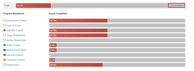 Щелкните ссылку «Показать / скрыть разбивку» (" Show/hide breakdown") на индикаторе выполнения области действия, чтобы отобразить или скрыть завершение области каждого элемента портфолио: