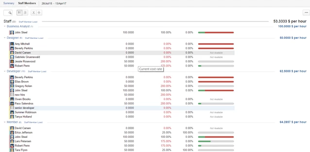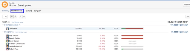 Экран «Персонал портфолио» позволяет легко отслеживать персонал, работающий над любым из проектов портфолио. Это дает вам кросс-проектное представление о людях, которое вы можете использовать, чтобы увидеть, кто перегружен. Это также позволяет вам видеть информацию о ставках тарифов, доступности и отработанном времени, а также краткое резюме задач, над которыми работает каждый человек. Перемещайтесь между представлениями «Резюме» ("Summary") и «Штатные сотрудники» ("Staff Members"), доступными в верхнем левом углу, когда выбрана вкладка «Персонал» ("Staff").