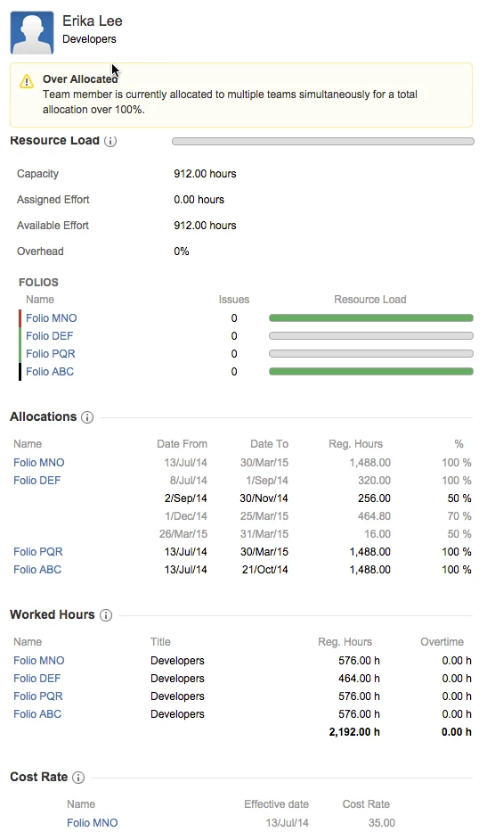 Совокупность накладных расходов сотрудника для каждого фолио в текущем портфолио. Накладные расходы на фолио дают соотношение объема работы, которая не была зачислена на фолио. Она вычисляется путем вычитания количества отработанных часов из имеющейся на сегодняшний день возможности (как определено процентом доступности сотрудника для фолио) и деления результата на имеющуюся возможность.