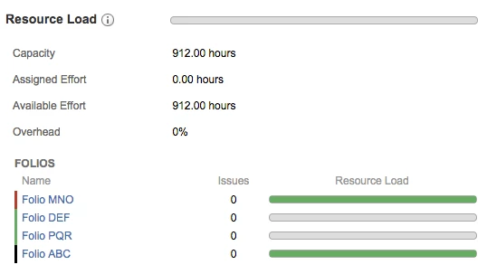 В разделе загрузки ресурсов отображается подробная сводная информация о загрузке ресурсов, а также разбивка по фолио. Это позволяет быстро просмотреть задачи JIRA, которые в настоящее время назначены штатному сотруднику по проектам портфолио. Дополнительные сведения см. в документации по загрузке ресурсов.