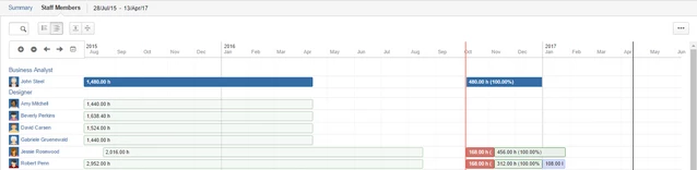 Временная шкала сотрудников разделена на две части маркером «Сегодня» ("Today") (отображается на графике красной вертикальной линией). Все часы, показанные слева от маркера «Сегодня» ("Today") (включая прошедший период от даты начала портфолио до сегодняшнего дня), являются часами, отработанными каждым сотрудником. Часы, показанные на столбцах справа от маркера (в будущем, до даты окончания портфолио), указывают возможности ресурса для каждого периода доступности. Поскольку доступность, показанная на временной шкале персонала, может быть получена из более чем одного фолио, доступность за определенный период может составлять более 100%, и в этом случае период доступности отображается красным цветом.