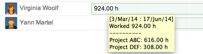 При наведении курсора на одну из полосок отображается период времени, соответствующий этой полосе, а также количество отработанных часов или возможность за этот период. Если за прошлый период суммируются часы, отработанные на двух или более фолио, во всплывающей подсказке отображается разбивка часов, отработанных для каждого фолио.