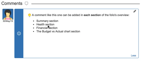 Если вы ввели комментарии в обзоре фолио или портфолио или на одном из их сводных экранов, они будут отображаться в отчете руководящего комитета. Если вы не указали дату в поле «Сравнить с» ("Compare to"), отобразится только последний комментарий с датой, равной или более ранней дате, указанной в поле «Статус по состоянию на» ("Status as of").