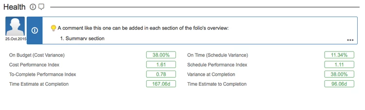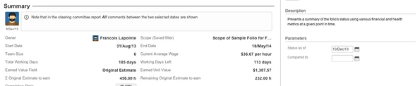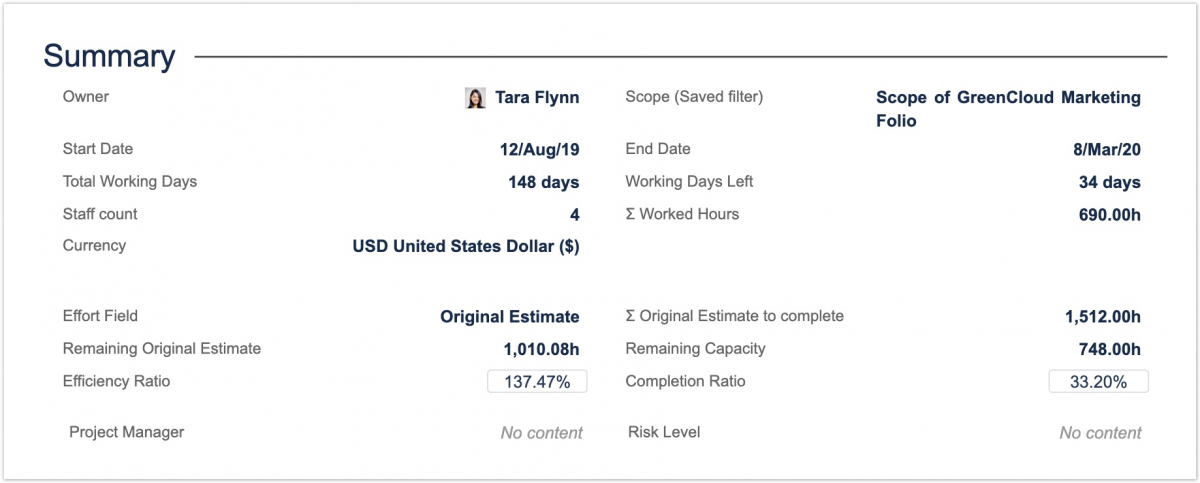 В резюме отображается основная информация о фолио, такая как имя, описание, информация об объеме, количество сотрудников и т. д. Информация, отображаемая в сводке, различается, независимо от того, использует ли фолио управление заработанной стоимостью или нет.