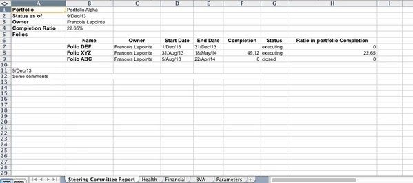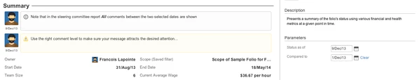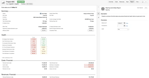 Отчет Руководящего комитета представляет собой сводную информацию о статусе фолио на заданную дату. В нем показаны те же финансовые показатели и показатели состояния, что и в обзоре фолио, но с более подробной информацией, рассчитанной на указанную дату. Чтобы получить доступ к этому отчету, щелкните вкладку «Отчет» ("Report") (или нажмите «6»), чтобы отобразить представление «Доступные отчеты» ("Available Reports"), затем нажмите кнопку «Показать отчет» ("Show report") рядом с предварительным просмотром отчета Руководящего комитета. Отчет создается с использованием сегодняшней даты по умолчанию. Вы можете изменить дату в поле «Статус по состоянию на» ("Status as of") справа. Отчет автоматически обновляется при изменении даты.