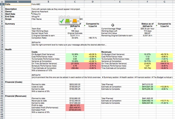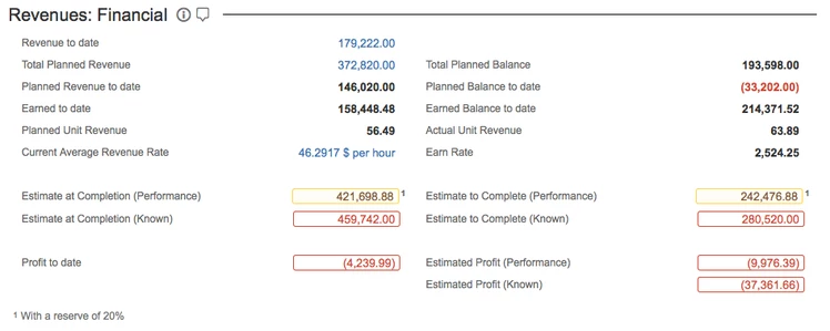 Предполагаемая общая стоимость (или доход) проекта на предполагаемый конец проекта (когда все текущие объемы должны быть выполнены с учетом текущей производительности). Это наивысшее значение между будущей известной фактической стоимостью на момент завершения и прогнозируемой окончательной стоимостью, основанной на прошлых результатах. При использовании EVM - прогнозируемая окончательная стоимость путем деления общей запланированной стоимости на индекс эффективности затрат (Cost Performance Index, CPI). См. Прогнозы для получения подробной информации о прогнозах. Если EVM не используется, прогнозируемая окончательная стоимость рассчитывается путем деления общего бюджета на коэффициент завершения ("Completion Ratio"). Цвет этого индекса зеленый, когда Фактическое ("Actual") значение меньше Планируемое ("Planned"), и красный цвет в противном случае. Резерв ("Reserve") в конфигурации учета фолио, если он установлен, определяет диапазон значений выше общего запланированного значения, для которого оценка по завершении станет желтым вместо красного. Для доходов цвет будет зависеть от другого параметра конфигурации (Учет> Отслеживать доходы> По расходам клиента)("Accounting > Track Revenues > As Client Costs"). Если эта опция не выбрана, то применяется обратное рассуждение для выделения цвета «Оценить доходы при завершении» (зеленый цвет, если выше запланированного, и наоборот). |