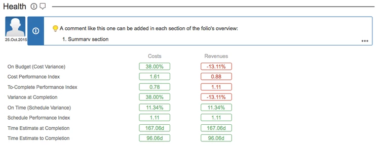 В разделе отчета «Работоспособность» отображаются показатели EVM фолио. Если фолио отслеживает доходы, то два набора показателей EVM отображаются рядом, первый столбец показывает показатели на основе затрат, второй - показатели на основе доходов.
