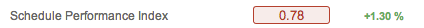 Отчет показывает, что индекс выполнения расписания увеличился на 1,30% между двумя сравниваемыми датами. Несмотря на то, что SPI, равный 0,78, по-прежнему считается плохим (на что указывает красный фон), изменение индекса указывает на улучшение (показано зеленым цветом), поскольку индекс переместился к своему оптимальному значению (положительная бесконечность).