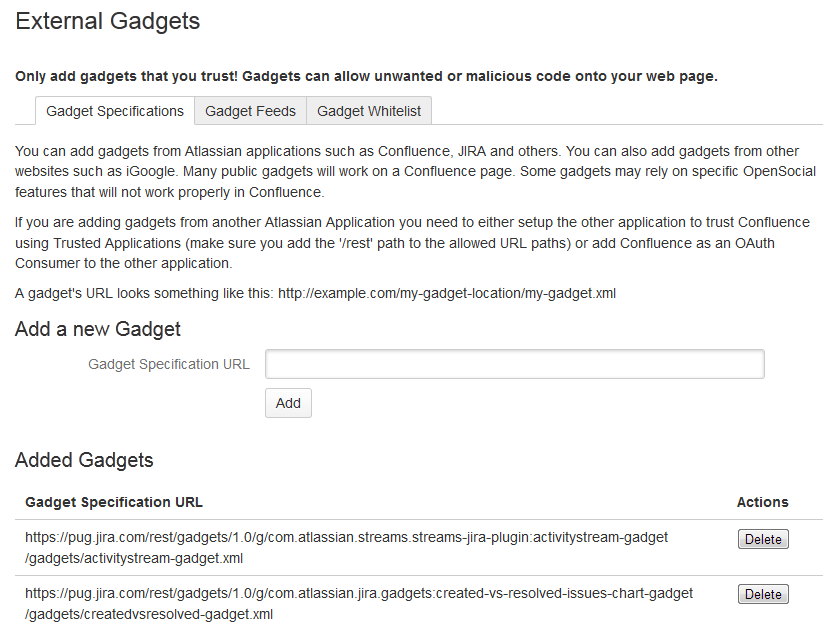 Чтобы удалить отдельный гаджет из Confluence, нажмите кнопку «Удалить» ("Delete") рядом с URL-адресом гаджета.