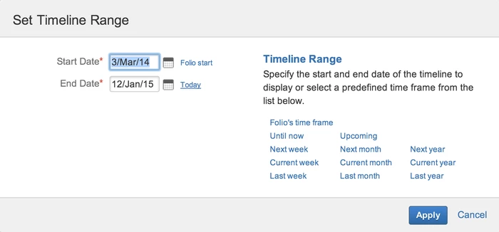 ) позволяет явно установить отображаемый временной интервал (горячая клавиша: r). При нажатии кнопки «Диапазон временной шкалы» ("Timeline Range") открывается диалоговое окно, в котором предлагается либо ввести точные даты, либо выбрать один из множества предопределенных периодов.