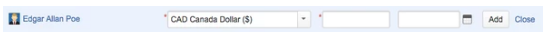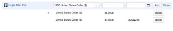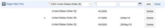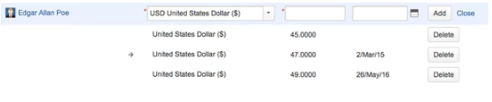 Чтобы добавить ставку затрат для пользователя, найдите строку пользователя в таблице и нажмите кнопку «Добавить ставку» ("Add Rate"), расположенную в конце строки. Откроется форма, в которой вы можете ввести информацию о ставоке затрат. Нажмите кнопку «Добавить» ("Add"), чтобы добавить ставку, либо нажмите ссылку «Закрыть» ("Close"), чтобы отменить операцию.