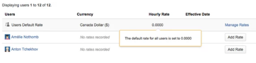 Ставки по умолчанию используются для сотрудников, связанных с пользователями JIRA, для которых не указана ставка в таблице расценок пользователей и не определена ставка затрат для его роли в фолио, а также для сотрудников, связанных с пользователями, не являющихся пользователями JIRA. Таблица ставок затрат для пользователей изначально пуста, а ставка по умолчанию установлена на 0,0000. Примечание появляется при открытии страницы всякий раз, когда ставка по умолчанию установлена на 0. Вы должны установить ставку по умолчанию, например, на среднюю почасовую заработную плату компании или среднюю почасовую оплату некоторой группы сотрудников.