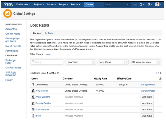 На странице «Ставки затрат на пользователя» можно визуализировать и определить почасовые ставки (заработную плату) для каждого пользователя JIRA, а также ставки затрат по умолчанию. Ставки затрат пользователей можно использовать в фолио для расчета фактических затрат на человеческие ресурсы. Чтобы эта страница была видимой и доступной, необходимо разрешение на управление ставками затрат.