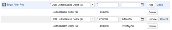 Чтобы обновить ставку затрат пользователя, найдите строку пользователя в таблице и щелкните ссылку «Управление ставками» ("Manage Rates") в конце строки. При этом под строкой будет развернут раздел, в котором будут показаны все определенные ставки затрат для этого пользователя.