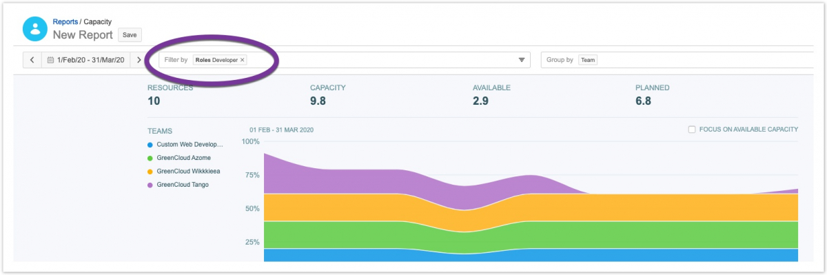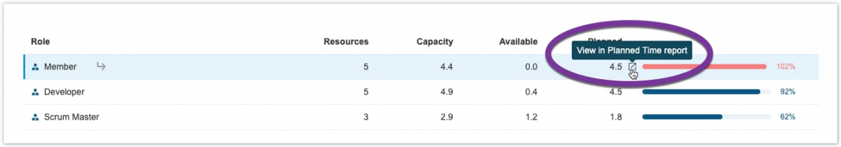Например, при просмотре возможностей по ролям вы можете захотеть увидеть, как запланированное время распределяется по сотрудникам за данный период. Фильтры будут перенесены из отчета «Возможности» ("Capacity "), поэтому, если вы откроете отчет «Запланированное время» ("Planned Time")   для роли X, где отчет «Возможности» ("Capacity ") отфильтрован, чтобы сосредоточиться на проекте A, отчет о запланированном времени откроется для роли X, отфильтрованной по проекту A.