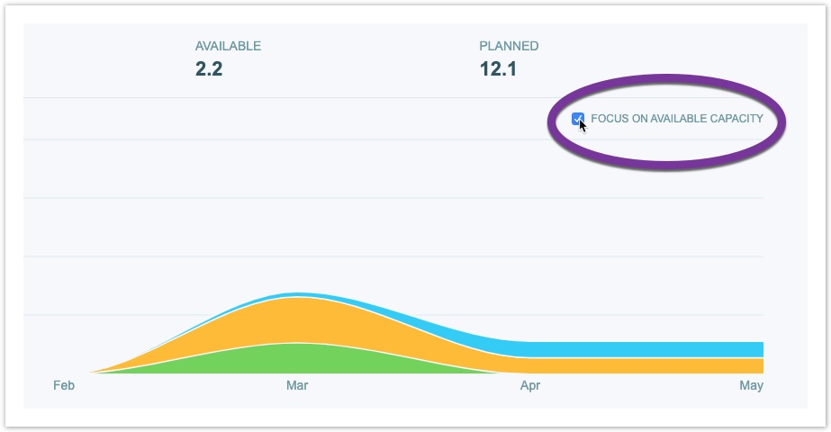 • Сосредоточьтесь на доступности. Может быть полезно сосредоточить внимание на доступной возможности, например, когда вы оцениваете осуществимость проекта на основе доступности ресурсов. Чтобы переключаться между ориентацией на плановую или доступную возможность, установите и снимите флажок в правом верхнем углу диаграммы.