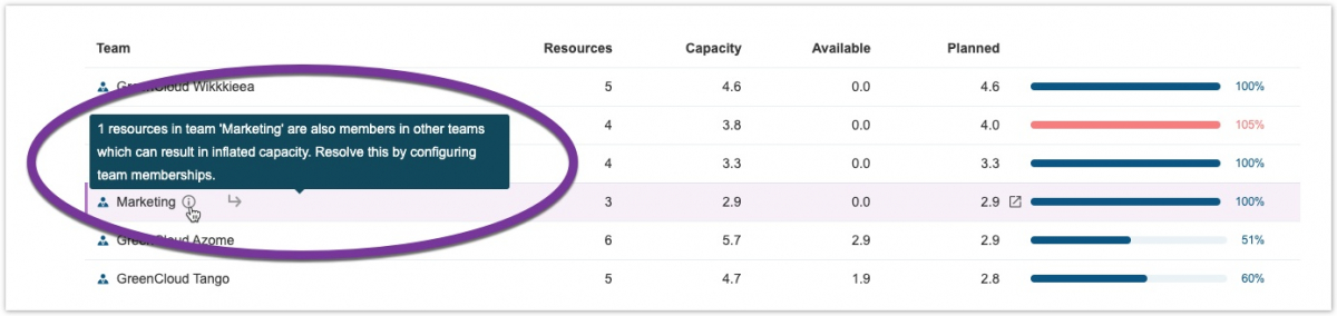 • Посмотрите, где участие в нескольких командах искажает общую возможность. Иногда сотрудники входят в более чем одну команду, что искажает общую возможность. Отчет обращает ваше внимание на эти случаи, чтобы вы могли учесть их при распределении работы.