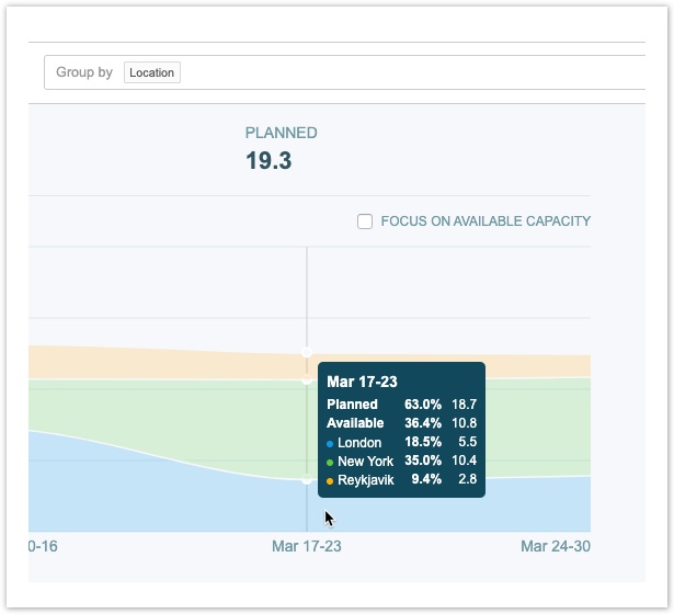 Например, если вы хотите узнать, достаточно ли у вас разработчиков для предстоящих проектов, вы можете сгруппировать отчет по ролям и выбрать, чтобы сосредоточиться на доступной возможности. Фильтрация просмотра по местоположению поможет вам лучше понять доступную возможность в определенном рабочем месте.