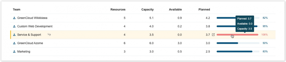 В этом примере для группы обслуживания и поддержки было запланировано 3,7 FTE, когда доступная возможность группы составляет 3,5 FTE. Если вы хотите увидеть, как это разбивается по отдельным членам команды, вы можете щелкнуть , чтобы просмотреть запланированное время для команды.