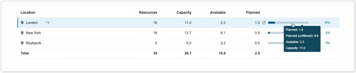 Темным цветом обозначены запланированные FTE для любого примененного фильтра, 1,5 в этом примере для лондонского офиса. Более светлый цвет, 8.6 в этом примере, показывает запланированные FTE вне области действия фильтра.