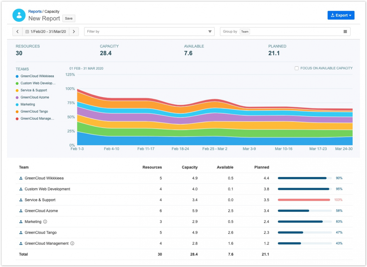 Отчет о возможностях помогает понять запланированную и доступную возможность сотрудников за определенный период времени. Вы можете составить отчет о численности персонала по командам, ролям, пользователям, местоположениям, программам, учетным записям и проектам, чтобы получить четкое представление о наличии персонала в вашей организации. Вы можете, например, использовать отчет о мощности, чтобы просмотреть мощность отдельных ролей, чтобы убедиться, что в организации есть нужные ресурсы, или просмотреть возможности своей команды и использовать эту информацию для корректировки распределения групп в соответствии с потребностями организации.