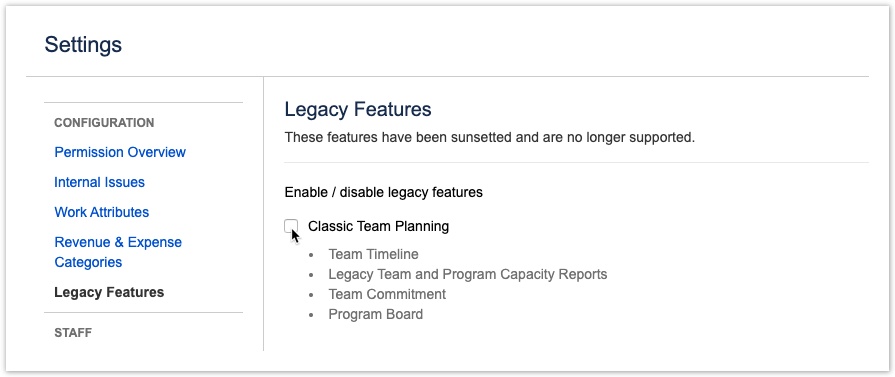 3. Установите флажок «Классическое командное планирование» ("Classic Team Planning"). Теперь вы можете установить обязательство членов команды команде. Снимите флажок, чтобы отключить функции.