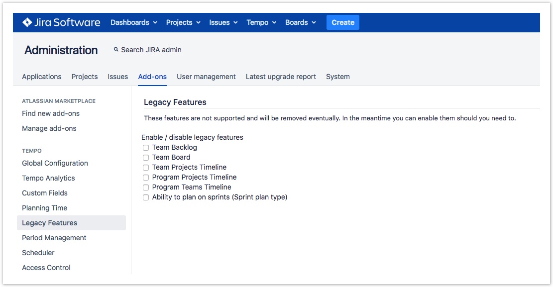 Чтобы получить доступ к наследуемым функциям в Tempo Planner, вам не нужны специальные разрешения. Доступны те функции, которые были включены в «Надстройки> Наследуемые функции» ("Add-ons > Legacy Features"):