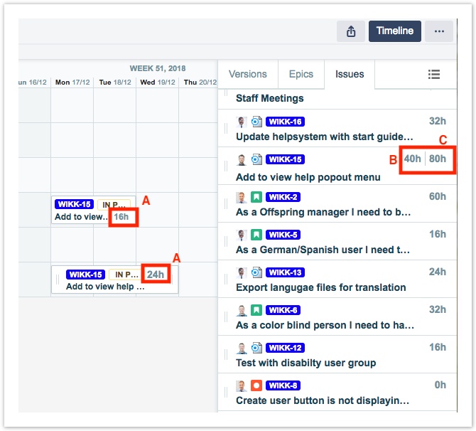 - На временной шкале цифры (A) в планах указывают количество часов, запланированных для двух членов команды для работы над одной и той же задачей.
