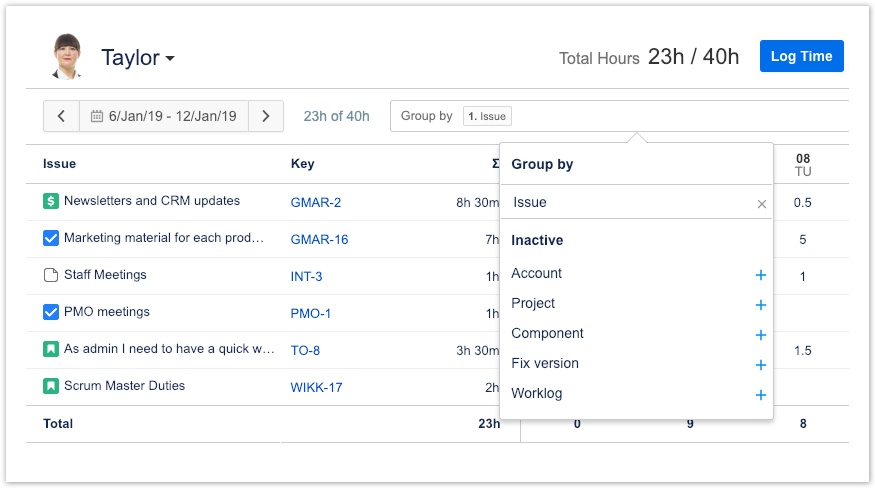 Группирование рабочих журналов при просмотре табеля учета рабочего времени - Timesheet View - Tempo Server