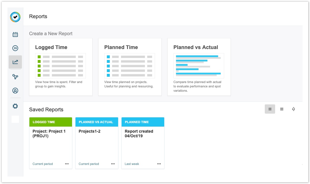 Отчеты доступны в обзоре отчетов ("Reports overview"). Чтобы получить доступ к обзору отчетов, выберите «Отчеты» ("Reports") на боковой панели Tempo. Вы можете создавать и получать доступ к любым сохраненным отчетам прямо отсюда.